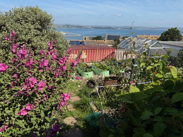 Whilst Laura was busy with the CommUnity Allotments including landscaping a new kids allotment plot this year, Etienne has spent months of effort landscaping the garden. Terracing the former steep grass slope. They call their garden their, ‘living pantry’ and it is such a joy to be in. The wide mix of crops are growing in abundance enjoying the fresh organic peat free compost. Retro looking light green raised beds are set beside a Rhino greenhouse chosen for its strength against storms. They purchased a shipping container to meet their storage needs since they don’t have a garage. This will be painted a shade of white and trimmed with wood to improve the appearance and reflect more sunlight. A future project is to install a living roof upon it. Also still to do is to maximise water storage. Four water butts are in place but the couple plan to increase this by a lot.