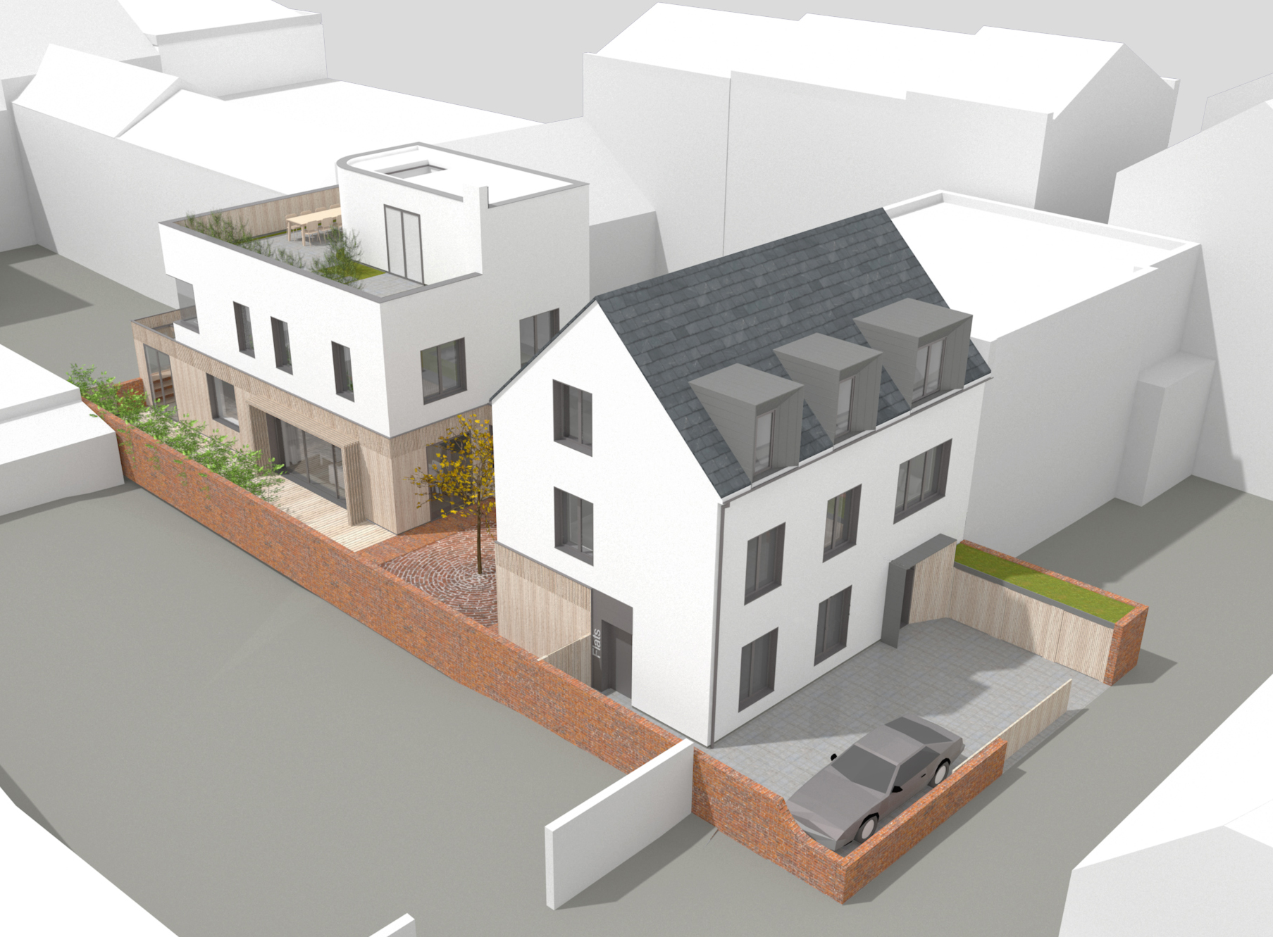 Sam and Sarah lived in an old mill house in the Bride valley, but felt that driving into Bridport two or three times a day was not sustainable, and decided to move into town. The Christian Science building had been vacant for 10 years, and they demolished it to build a house with two flats, which are rented out. They moved in in 2021.